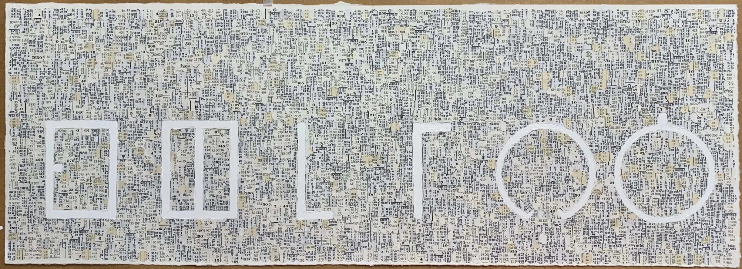 40 days & 40 nights (ink & paper on paper) is composed of 40 4" x 4" blue squares and 40 4" x 4" black squares. The circles in the center of each square is 40 circles with in the each circle. The circles were cut from from maps some of which were painted black. The circles progress through the days adding or subtracting a black circle. The circles are a count down. The plan is to hang the piece length wise with the blue squares on the top row and black squares on the bottom. The approximate size of the piece is 15' x 8". The pricing is $40 each per square with a 4 square minimum.